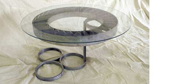 Made of reclaimed steel jet engine exhaust pipes, this 18″-tall table is topped with clear glass…the better to see the exhaust’s sculptural form.